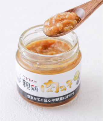 旨味溢れる親鶏の肉を使用した肉味噌です。 ご飯のお供や、スティック野菜などのドレッシ ング代わりにも美味しくお召し上がりいただけます。